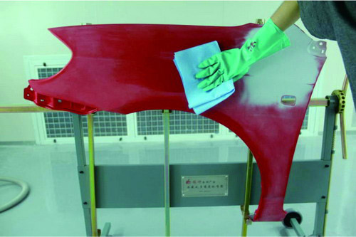 清潔的方法為:一手用沾有金屬清潔劑的布擦拭第一道,另一只手馬上用干布將第一道擦拭的濕痕擦干,以吸附、去除銹跡、油漬和蠟漬。清潔工作的面積如果比較大,不要用清潔劑一次性擦拭整個表面之后再用干布擦拭第二遍,而應一道一道地清潔,確保第一道在沒有揮發(fā)的情況下就馬上用干布擦干,這樣有利于完全清潔干凈工作面,如圖2-12所示。