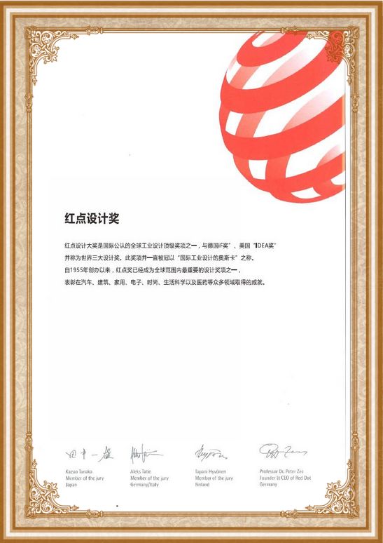 紅點設計大獎是國際公認的全球工業(yè)設計頂級獎項之ー,與德國“iF獎”、美國“IDEA獎”并稱為世界三大設計獎。此獎項并一直被冠以“國際工業(yè)設計的奧斯卡”之稱。
